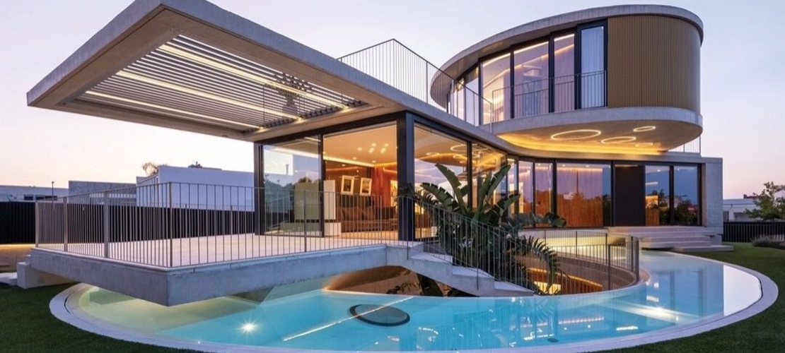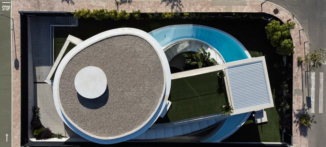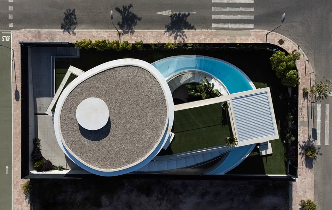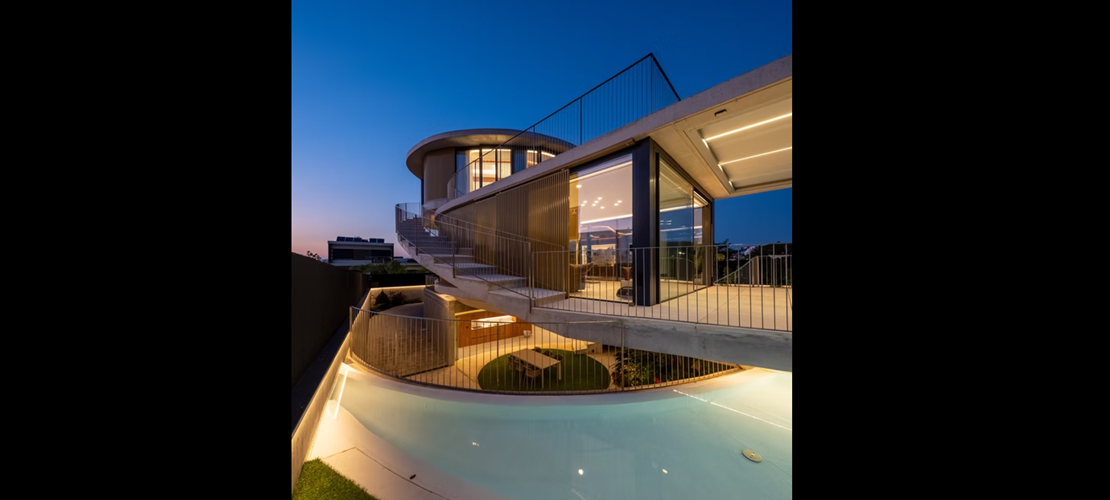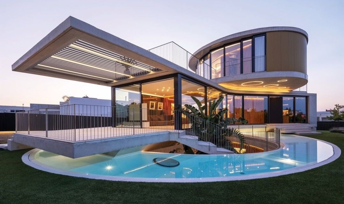 La estructura horizontal de la vivienda se resuelve mediante losas de hormigón armado de 25 cm en el caso del cuerpo inferior, y losas de hormigón armado de 30 cm en los dos forjados de forma ovoidea, con objeto de controlar las deformaciones en los grandes voladizos.