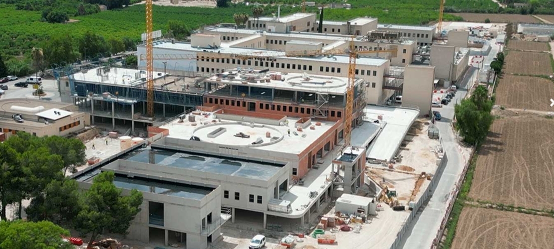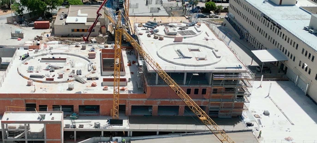 El módulo A presenta planta baja y dos niveles sobre rasante. Los módulos B, I, J1, J2 y J3 presentan planta baja y un nivel sobre rasante destinado a usos de cubierta.Los módulos C, D, E y F presentan únicamente una planta baja que sirve de plataforma de acceso al hospital (los módulos D y F presentan además casetones que cubren los accesos de escalera y ascensor). Por último, los módulos G1, G2y H presentan planta baja y tres niveles sobre rasante; además, son susceptibles de ser ampliados una planta extra en elfuturo.